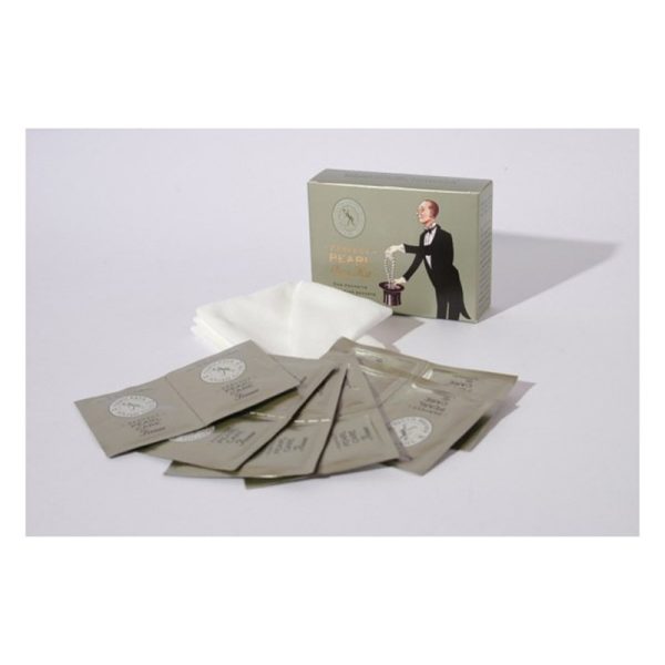 Il kit è composto da unn contenitore di latta contenente 8 panni umidi per pulire e 1 panno in microfibra per asciugare e lucidare le perle.